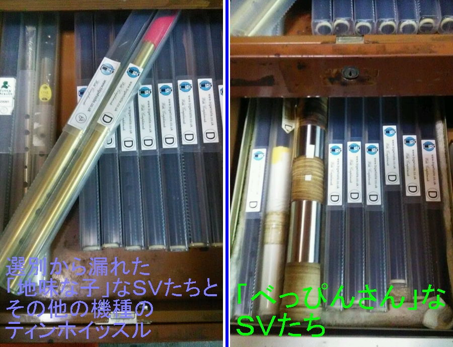 あ、一つ上のやはりカギ付き引き出しには、それ以外のSVたちが入ってます。これは昔から作っておいた「笛金庫」です。これで笛金庫が二つになったー。わーーーい。