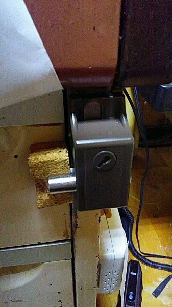 そして以前から両面テープで取り付けておいた、地震対策とか赤ちゃんのケガ防止用の、プラスチック製の引き出し止めのロック部分をパチンとはめます。プラスチックロックのほうは指で簡単にロック解除できるので盗難防止効果は無いんですが、カンヌキ錠前のほうで充分できてるので。