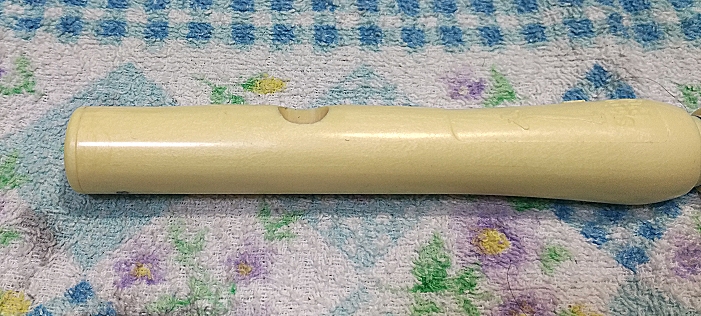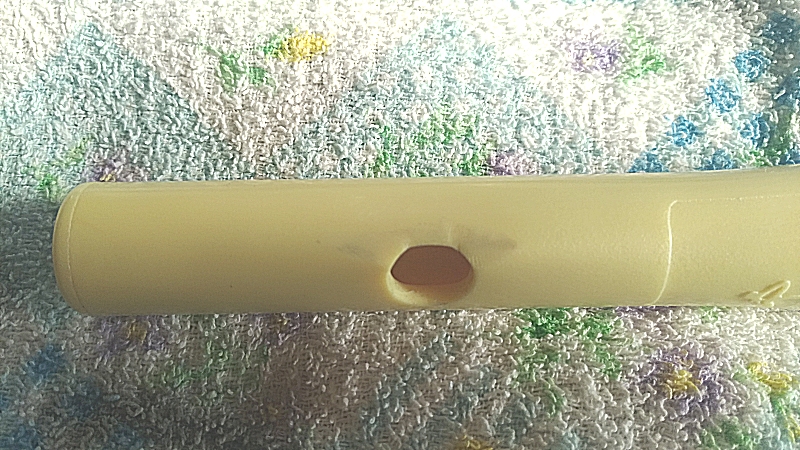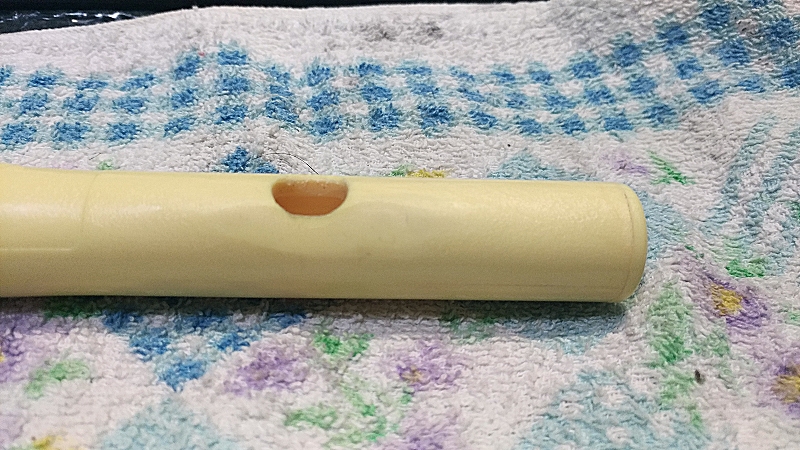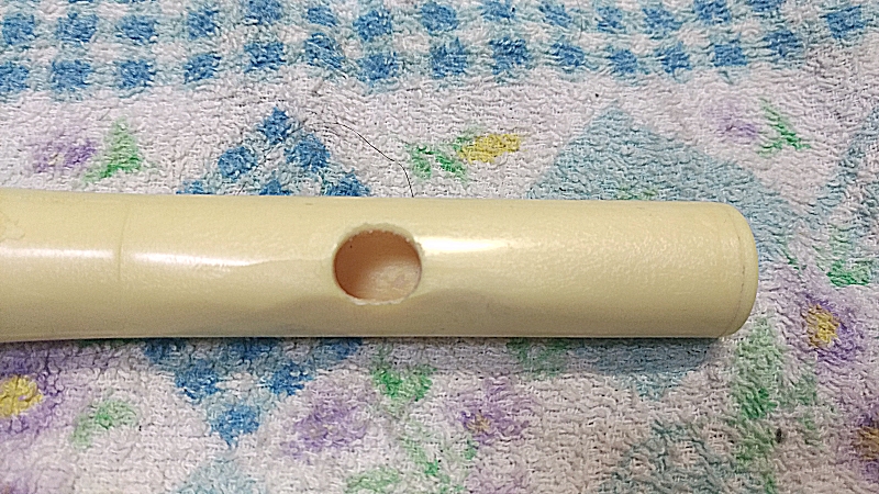 Shining Piperのページに載せてある運指表のとおり、この「キーホール開け押さえ」と代え指を使えば12音階に完全に対応できる設計です。最初はキーホールにシリコンのキャップが付いてきますけど、幼児がキーホールの塞ぎミスを防ぐために配慮したキャップなので、すぐに外しました。つまようじで表側から押すだけで簡単に管体内部に落ちて、あとは管体をゆすってキャップを取り出せばOKでした。