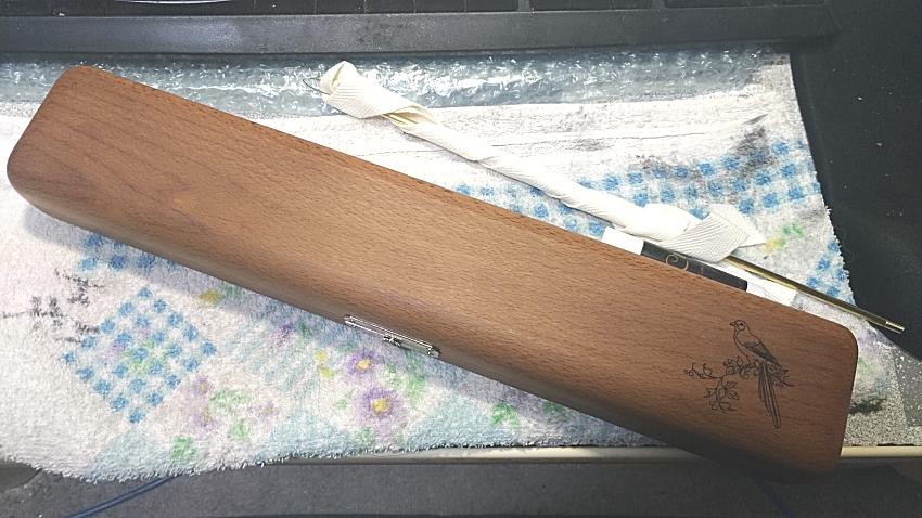 高級感のある木のハードケースです。掃除棒はレザーケースのポケットに最初からガーゼ付きで入っていました。