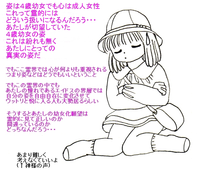 ではなぜサイト名を幼女の年齢のみにしないかというと、幼女の心だけになったらあまりにも精神が脆くなりすぎて打たれ弱すぎる(経験多すぎるし)から、それだと地上でも霊界でもしょーもなく弱い魂になっちゃうので、姿と心は幼女なんだけど、その土台に20歳女のしっかりした強い魂がどっしり根付いてるので、サイト名は20歳のままでいいのです。