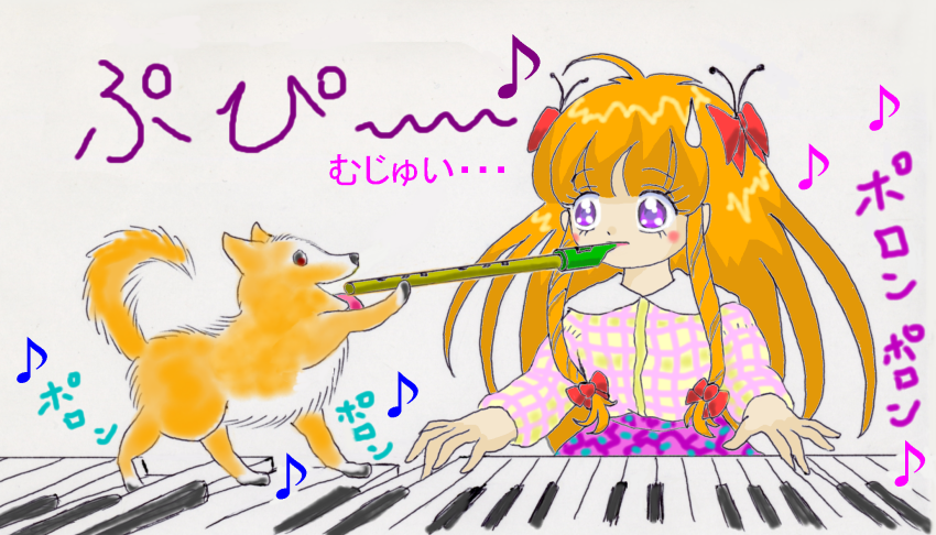 8歳の姿に戻ってヒーリーピッコロを吹く私。笛を吹く幼女。