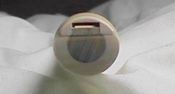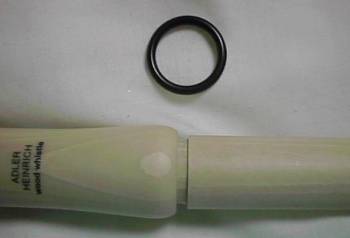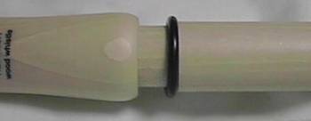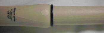 ウインドウェイの下部にはメイプルとは違う材質の木がはめ込まれているようです。この材質は何なのかちょっと解らないんですけど、メイプルより膨張率の低い木なんじゃないかしら? と思います。膨張率の低い木をウインドウェイ内部に使って管体の割れを防いでいるということで。それでも、吹き倒して無造作に放っておくと、ウインドウェイが水分を吸い込んでヒビが入ったり割れたりすることもあるので、吹き終わった後はウインドウェイの水分を除去しなきゃならないという、管理に気を遣うティンホイッスルです。木の材質を変えて割れを防いでも限界があるようで。