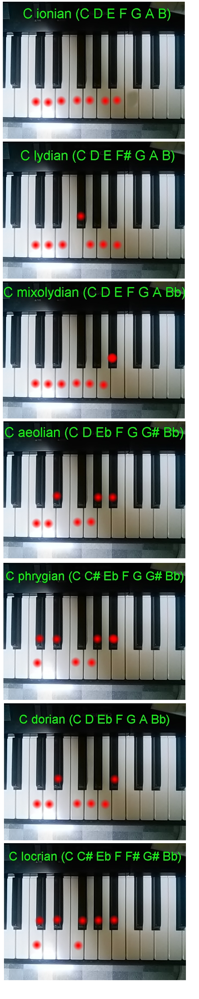 便宜上key=Cにしているが、上で紹介した7種類の教会旋法。