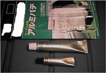 そこで思い付いたのが、一体成型のアルミニウム管体とウインドウェイなので「アルミパテ」を使うということです。自動車のアルミホイール補修に最適、耐熱温度はなんと100度、老朽化の心配は無い、いいことずくめですね。