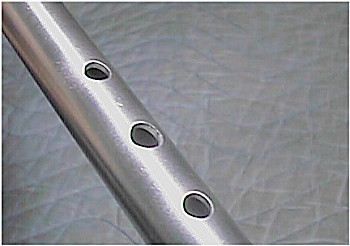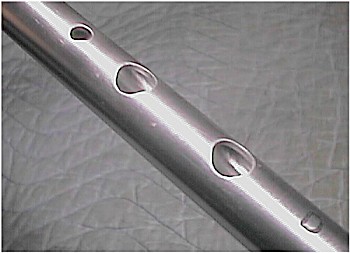 ここでの最重要項目は、必ず下の(低い音の)トーンホールから削ることです。なぜかというと、低い音から作業を始めることによって、音程が積算されて高いトーンホールに影響を及ぼすからです。トーンホールの大きさによるピッチは低い音から順番に積算されるために、低い音から始めないと、高い音での正確性が無くなってしまうので。音程が積算されるっていうのは、私の「たぶんそうなんじゃないかな?」という考えに過ぎませんけど、とにかく低い音からやっていったほうがやりやすいと思います。