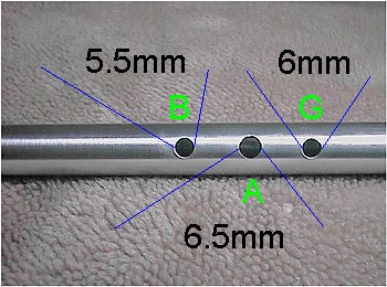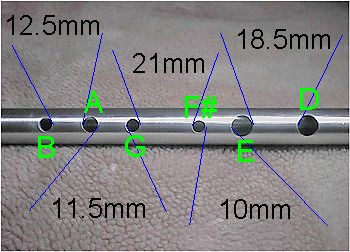 そこで、G・A・B・C#のピッチを標準ピッチにまで上げるために、各トーンホールを削って拡大してみようという試みです。G・A・B・C#のピッチをいじるということは、F#・G・A・Bのトーンホールを削って大きくすることになります。