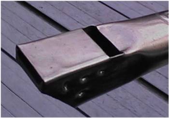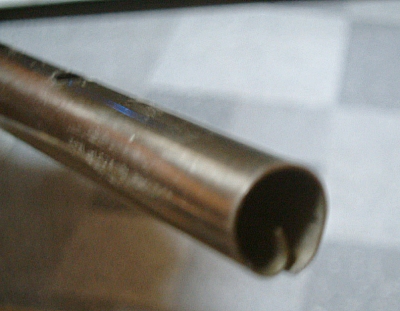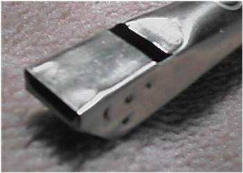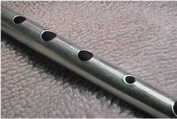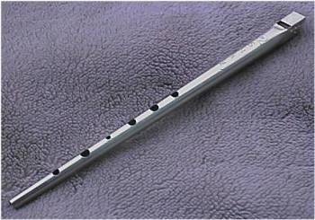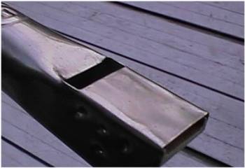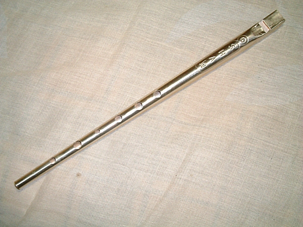 息に対する反応も悪く、かなり吹き込まないとまともな音が出ないという、困ったティンホイッスルです。この原因は、エッジの作りが雑なために、息の流れが綺麗に当たらないせいのようです。いやはや、悪いところだらけですね。これだけ出来の悪いティンホイッスルも珍しいわん。