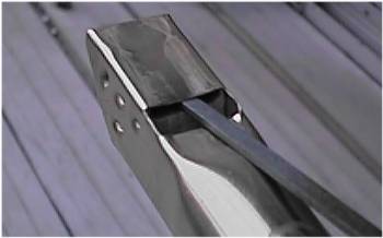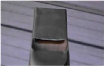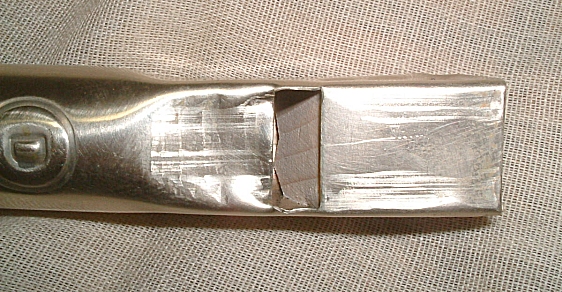 親指の爪でウインドウェイ出口を潰します。ショウは、材質であるニッケルシルバーの板が薄くて曲げやすいので、親指の爪で充分かと。