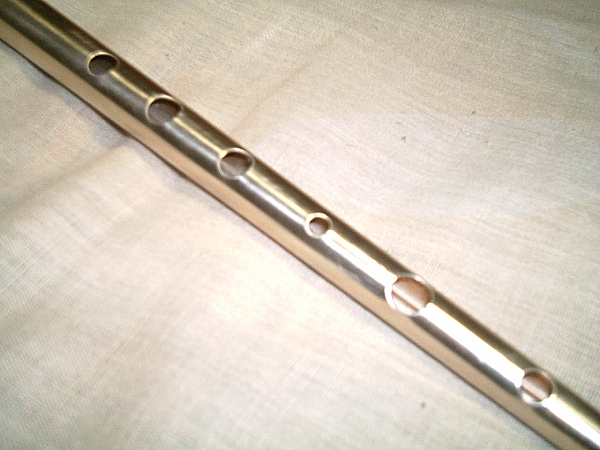 ショウの工場出荷状態では、ピッチはほぼA=440Hzに合っています。最先端のティンホイッスルのピッチが上がり続けている(いた?)のに対して、ショウはピッチまで昔のまんまというカンジ。ただ、元々の作りがいいかげんなので、トーンホールごとのピッチの狂いについては、一本一本のバラつきがありそうです。それにしても、最近の演奏現場の基準ピッチはどんどん上がってきてて、ティンホイッスルもそれに合わせざるを得ない時が多いし、明るい音色に聞こえるようにA=445Hzくらいの演奏現場もあるのですけど、これは迷惑な話で、大きなお世話ですよほんと。