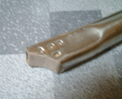 今後ゆっくりと時間をかけて吹き倒していきたいと思いますけど、その前に、木のブロックを水分から守るために事前処置をしておかなきゃ、ってことで、まずは、表面保護作業をする前に、下唇が当たる部分を更に丸く削って、よりくわえやすくしました。グラインダーがあればラクだったんですけど、ないので丸ヤスリで根気強く削りました。結果、こんな風になりました。