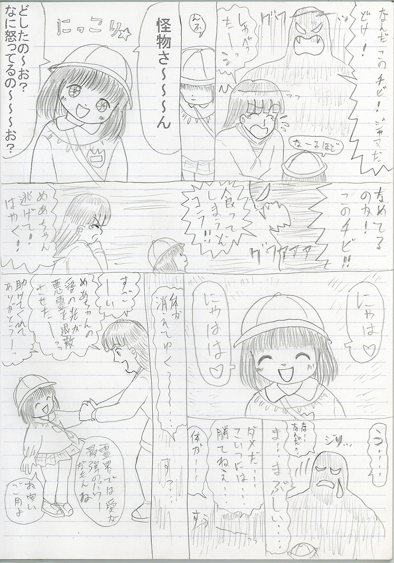 「にゃは にゃはは」の意味=「怪物さん、あなただって元は人間だったんだろうし、ちっちゃい時は優しい心を持っていたはずだよ。だからこの霊界にも宇宙にも悪人なんて居ないの。神様は、最初から悪に染まった魂なんてものは作らないの。だから、あなただって本来は優しい人なんだよ。私、そんなあなたが大好き。一緒に遊ぼうよ。何して遊ぶ?」です。んで怪物さんは襲う気を無くして消えていった、というね。