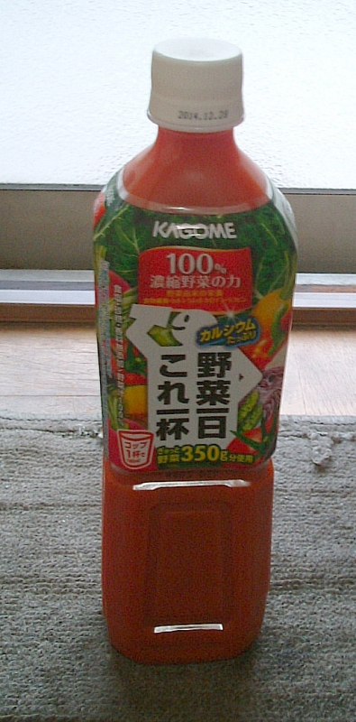 あ、最近あまりにも味気ない飲料生活に耐え切れなくてコーヒーだけは再開しましたけど、それ以外の清涼飲料水は飲まないですねー。飲むとしたら、私野菜の好き嫌いが激しいので(ジャガイモやニンジンやタマネギやトマトやキャベツやレタスなどは大好きでも、ピーマンとかセロリとかアスパラとかキュウリとかナスとかパセリが大嫌い)、その野菜摂取のバランスを補うためにも野菜ジュースをガブガブ飲んでます。特にカゴメの「野菜一日これ一杯」が大好きで、毎日飲んでます。普段は近所のスーパーで大きなペットボトル(720ml)をたくさん買いだめしておいて、それをうっかり夜中などに切らした時にはコンビニで紙パックの小さいのを緊急で買ってます。昔は野菜ジュースって飲まず嫌いだったんですけど、カゴメの「野菜一日これ一杯」を飲んでみたらもう美味しくて美味しくて。これです。