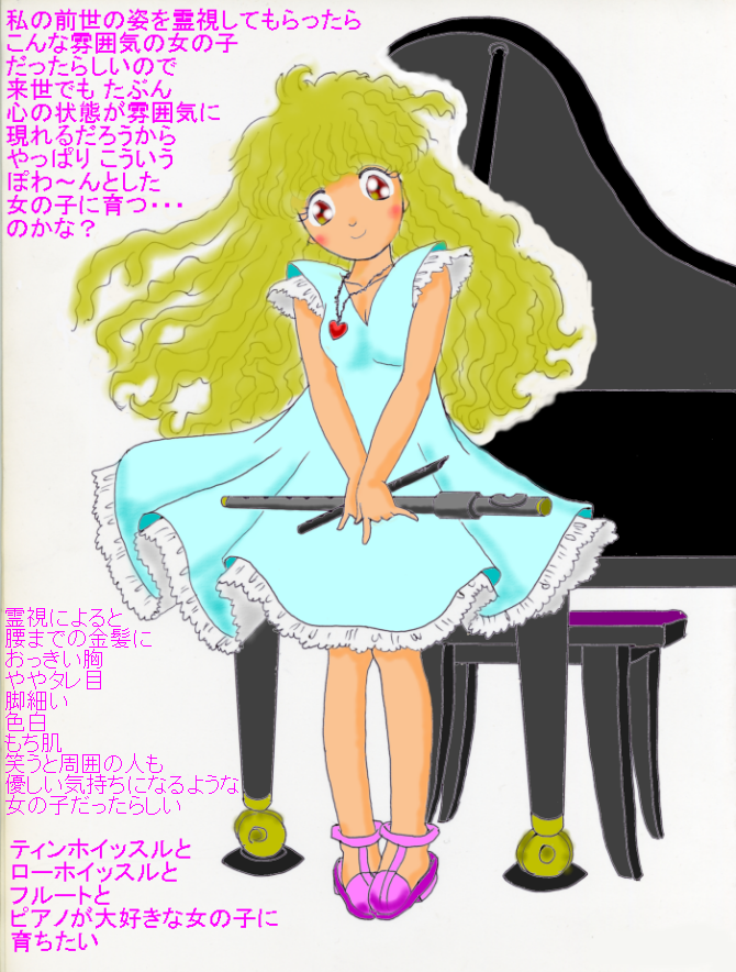 とかいろいろ想像すると楽しい。生き甲斐にまでなる趣味を見つける、というのは、たぶん楽器、とりわけミニ横笛(ピッコロやファイフ)ってことだったんでしょう。二つの前世でも何か楽器をやっていたのかもしれないけど、生き甲斐にまでなる趣味というほどの思い入れではなかったと思うし。たぶんだけど。
