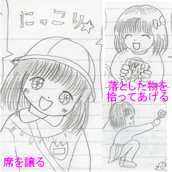 「座ります? どうぞ」 「落としましたよ〜。はい」