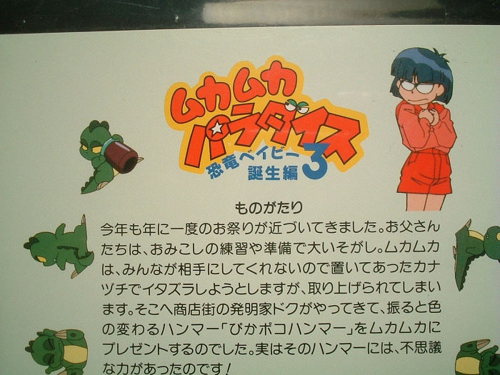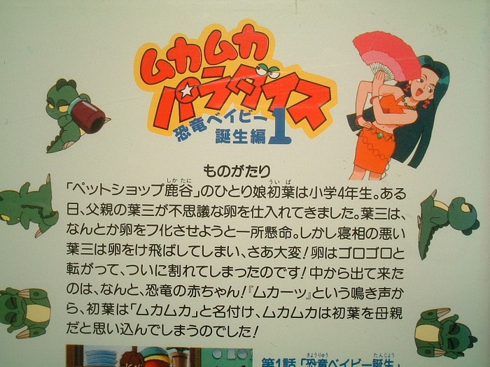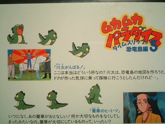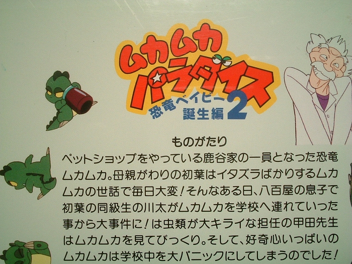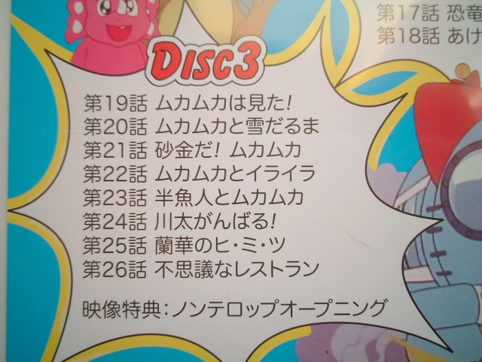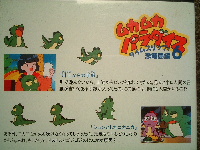 余談ですけど、ムカパラの作画担当者の中では、個人的に渡辺明夫さんの絵柄が大好きです。「恐竜の怖いもの」、「学校でムカムカ」、「恐竜がいっぱい!」、「あけましてムカムカ」、「川太がんばる!」、「花見でムカムカ」、「なつかしの商店街」、「シュンとしたニカニカ」、「地図伯爵ブンドイ」の作画監督を務めている人です。この人の描く初葉の絵柄と表情は、個人的にとってもお気に入りです。特に初葉がお姫様になる話の「地図伯爵ブンドイ」、よかったですー。ブンドイの言葉、「謝る勇気さえあれば、幻の戦士は消える」、いい言葉だ〜。